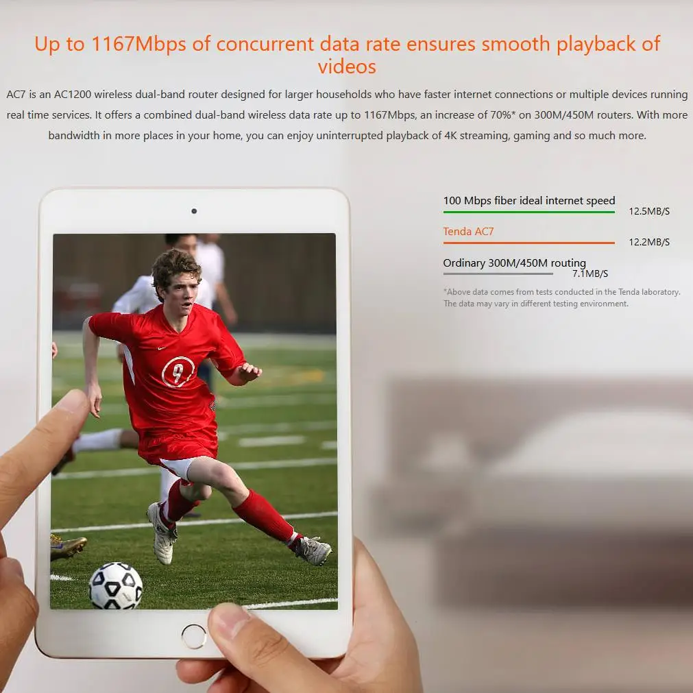 Sa simultanéité double bande de 2.4GHz et 5GHz permet des vitesses de connexion sans fil allant jusqu’à 1167Mbps, ce qui est 70% plus rapide que les routeurs de 300M / 450M.