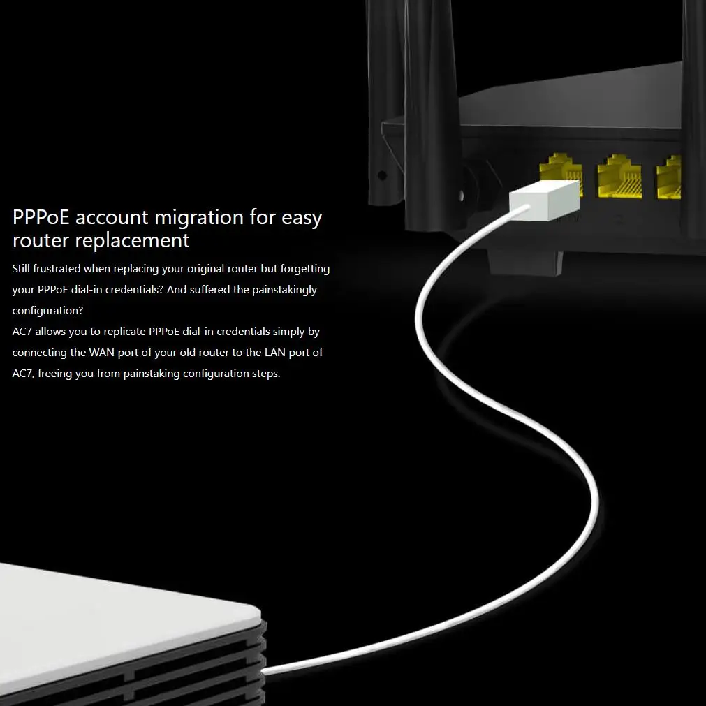 AC7 vous permet de reproduire les identifiants PPPoE en connectant simplement le port WAN de votre ancien routeur au port LAN deAC7, vous libérant ainsi des étapes de configuration laborieuses.
